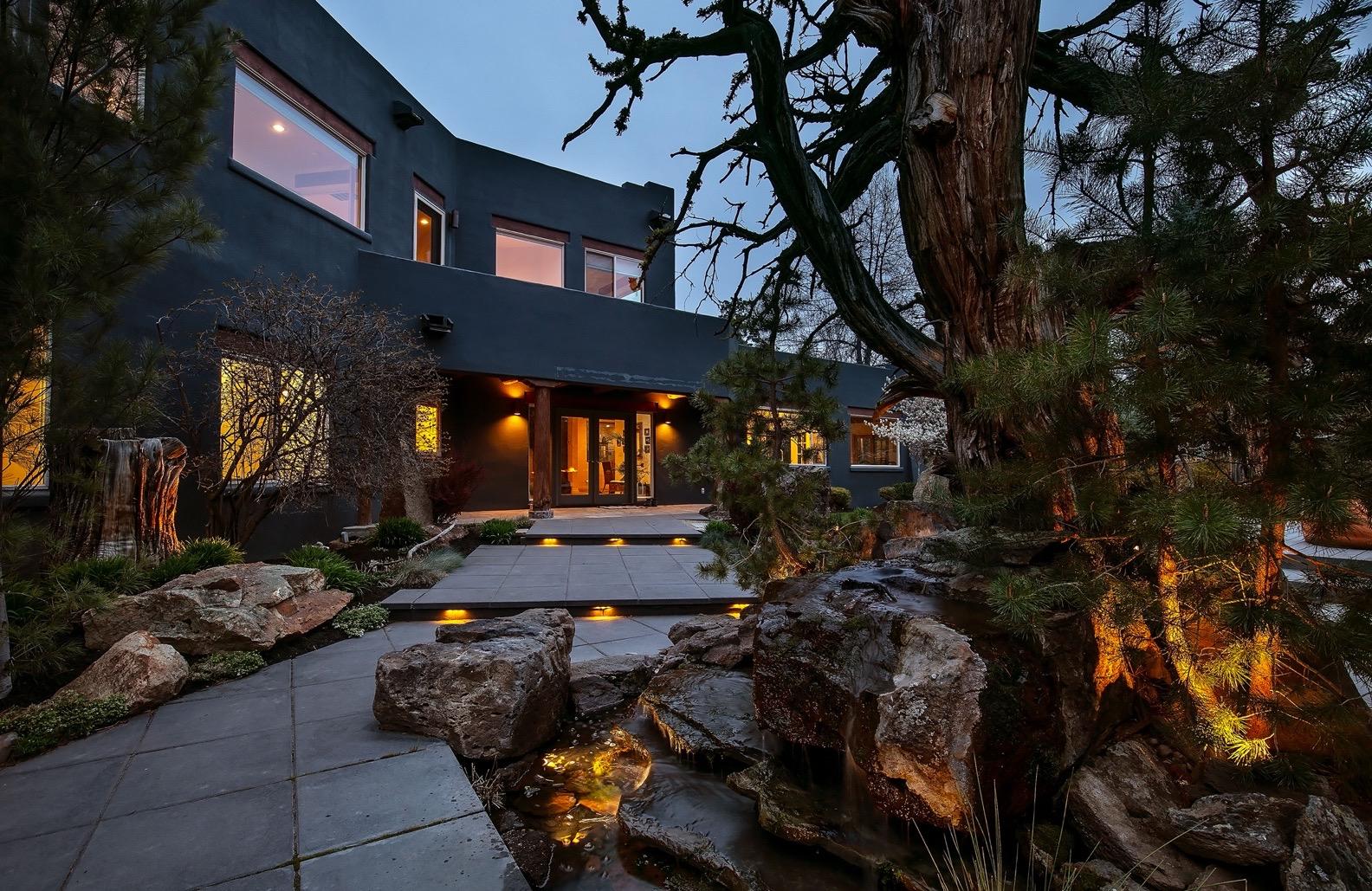 • Beautiful outdoor living with patios, decks, waterfall water feature, custom gas fireplace