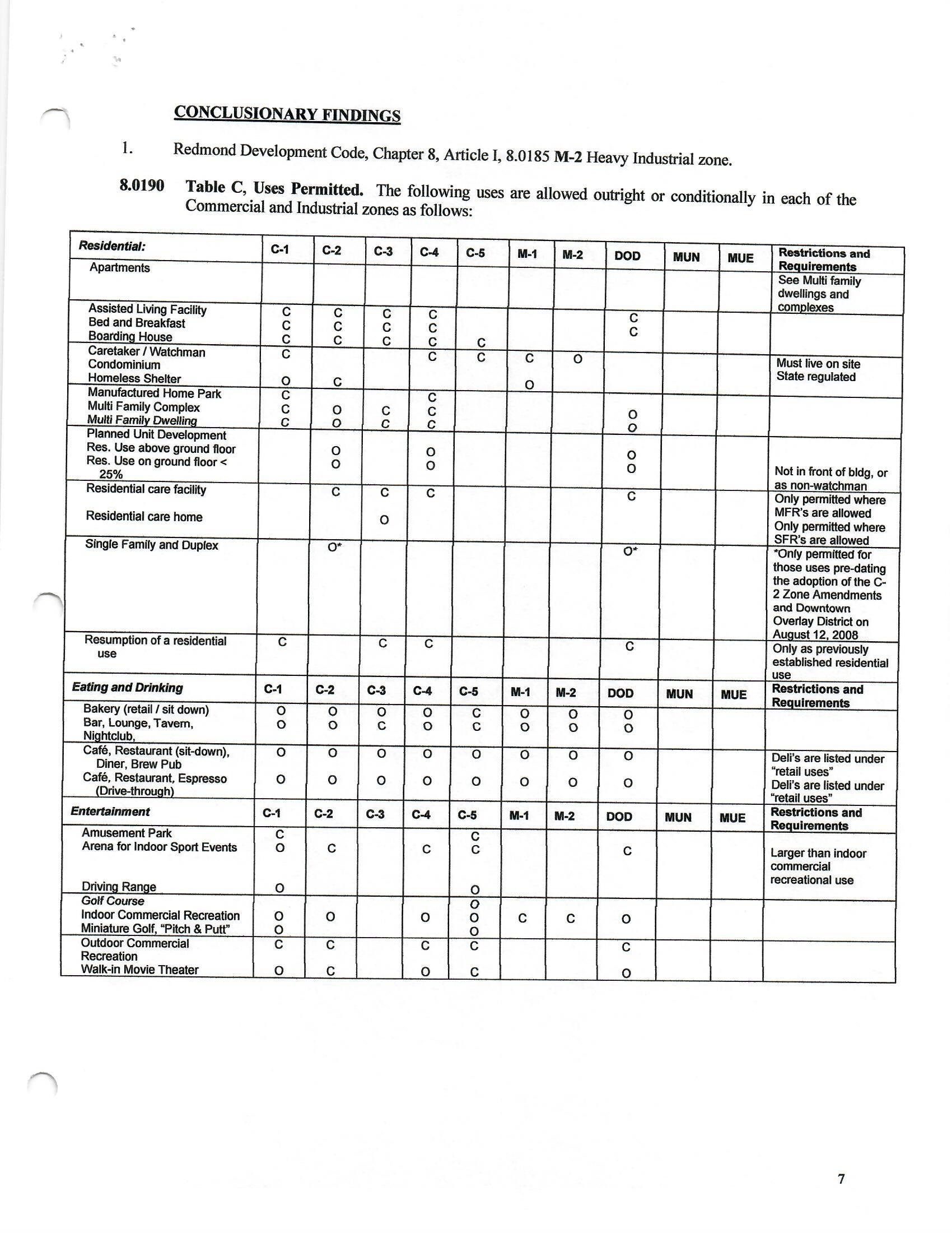 8.0190 Table C, Uses Permitted. The following uses identified below are allowed outright or conditionally in each of the Commercial and Industrial zones. Outright or conditional uses in the M-1.5 zone may be permitted Conditionally in the M-1 or M-2 zones; this allowance does not apply for uses Not Allowed (“N”).
