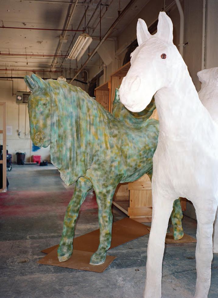 Immersing ourselves in the stories of place awakens us to its mythologies. Again, it’s artists rather than historians who are perhaps best sensitized to the ways in which our connections with the past have been de-historicized to serve the realities of the dominant. Cowboys are a good example. For most of us, the expansiveness and freedom of the American West is inextricably tied to the Stetsoned architype. Tschabalala Self sees that history as one of exclusion through omission. Her installation, “Pioneer,” is an equestrian statue that inserts itself in a lineage that runs from Frederick Remington’s wild bucking broncos to our own more overtly controversial rendition of a former Palm Springs mayor on horseback. Forgoing the forefathers, Self’s focus is on the foremothers, the largely unidentified Native and African American women whose bodies and labor allowed for U.S. expansionism and growth.