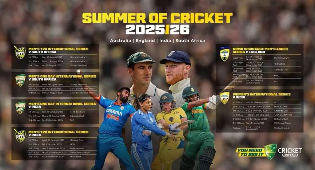 With thrilling rivalries, historic series, and iconic venues, Cricket Australia’s 2025/26 season is set to be an unforgettable chapter in the sport’s history. Fans can look forward to a summer filled with gripping action, high stakes, and memorable moments on the cricket field. Whether it’s the Ashes, the T20 World Cup preparations, or the women’s historic multi-format tour, cricket will truly be “everywhere” this season.