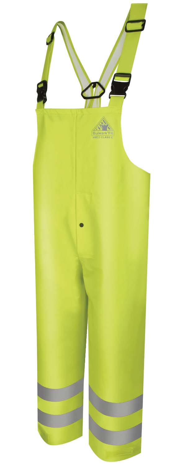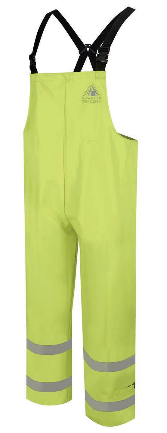 Quick release suspender, FR snap fly, FR leg cuff adjusters. Non-conductive durable hardware. 2” reflective striping. Elasticized shoulder straps with nonconductive adjustable hardware. Take up tabs at ankles. Water repellent. 10 oz, ATPV 24, ARC 2, ANSI Class 3, Type R 118047 (71) Hi-Vis Yellow