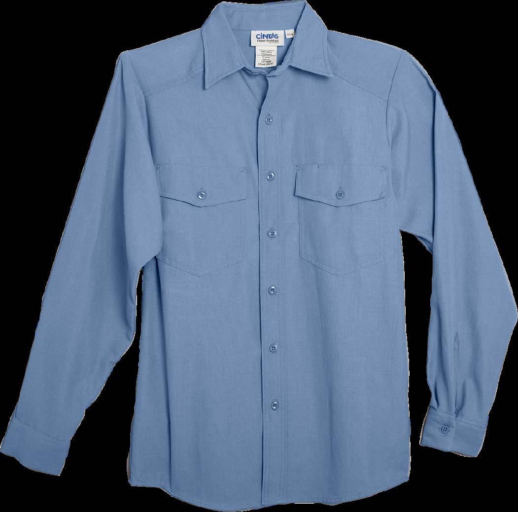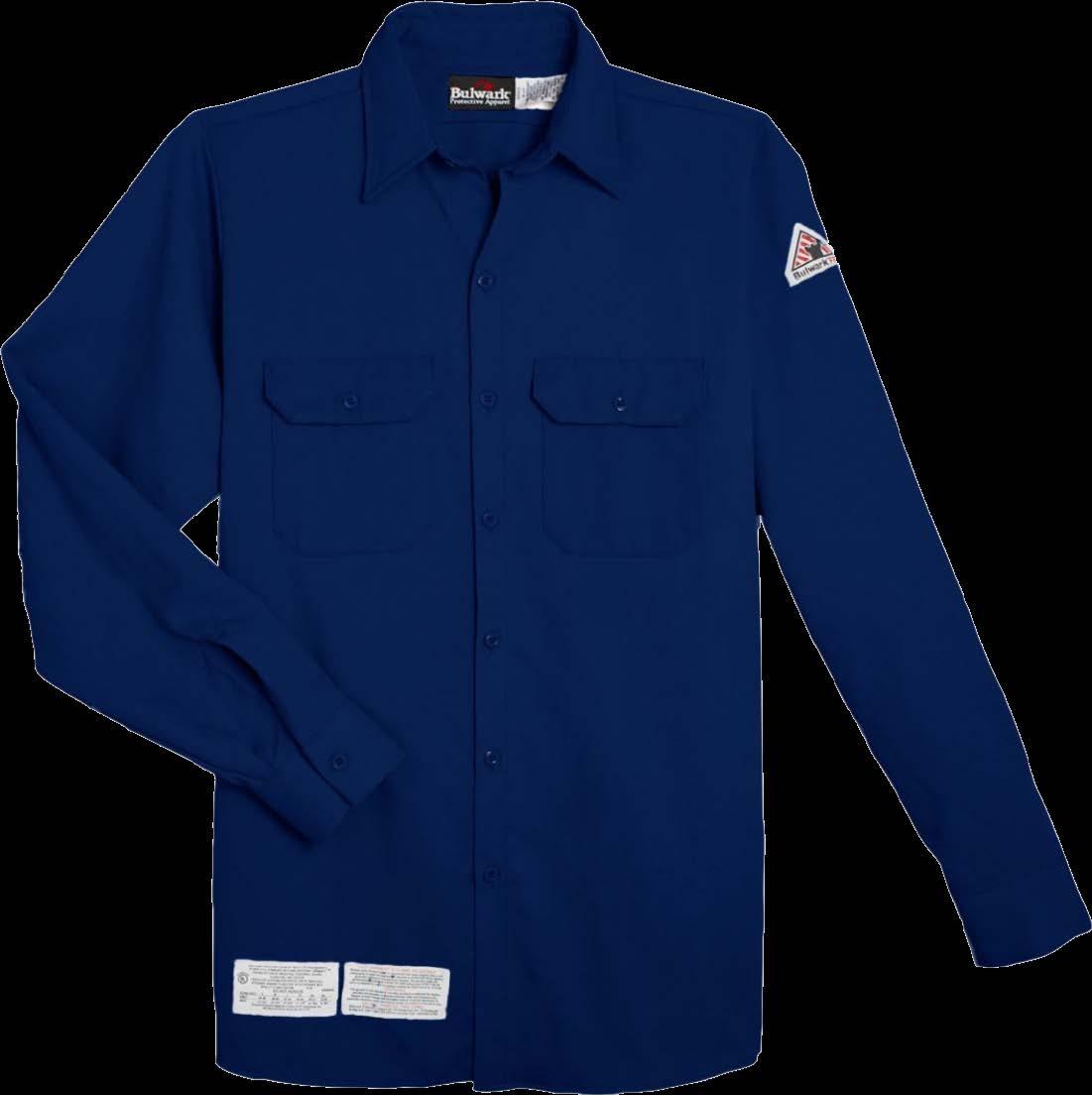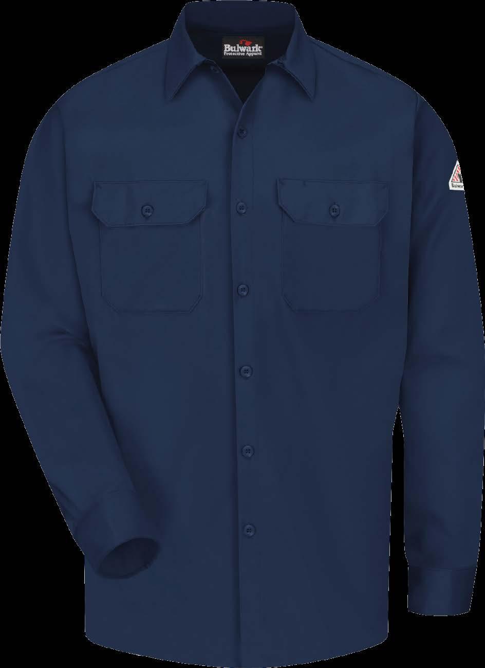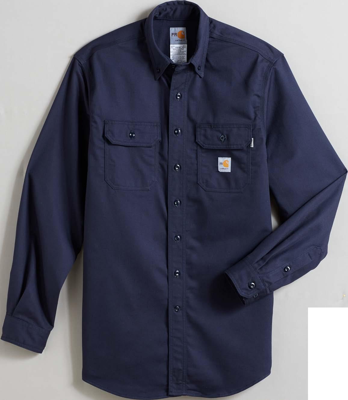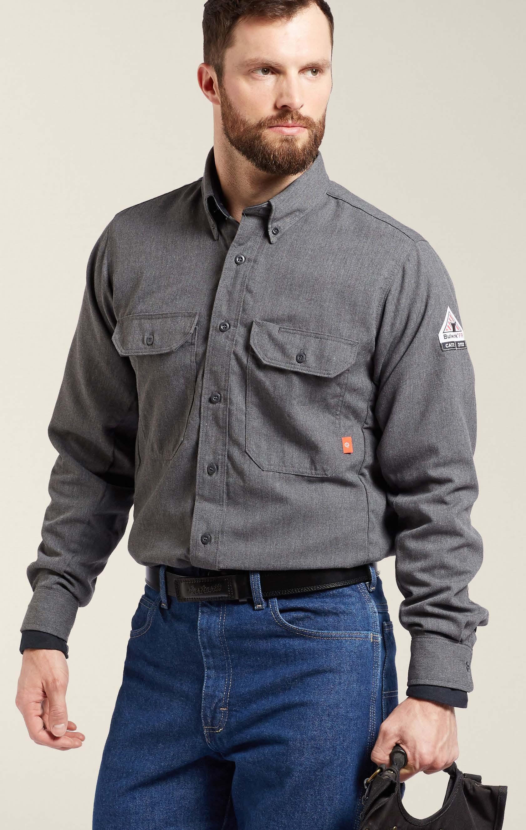 Designed to stay tucked in with an extended shirt tail. Crisp button-down front in FR twill, left chest pocket and adjustable cuffs.