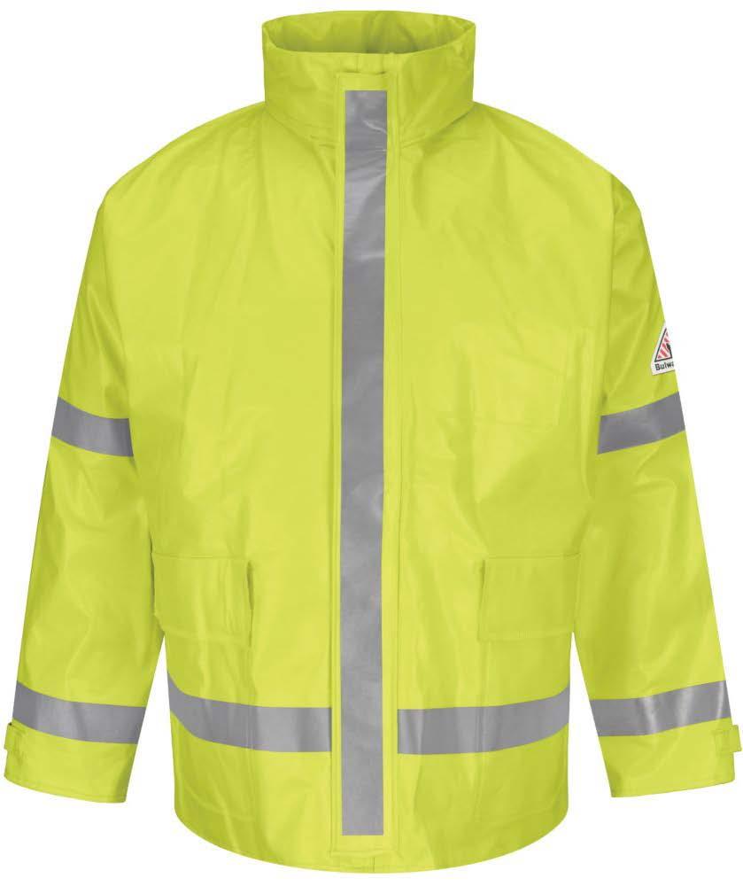 Separating heavy duty Nomex® taped brass zipper, fully covered with two-layer storm flap, concealed snap closure. Two layer stand up collar. Two large external patch pockets with concealed snap secured flaps with handwarmers and one inside chest pocket. 360° visibility with front and back 2” silver reflective striping. Utility loop at shoulder. Water Repellent. 7 oz, ATPV 31, ARC 3, ANSI Class 3, Type R 117938 (71) Hi-Vis Yellow