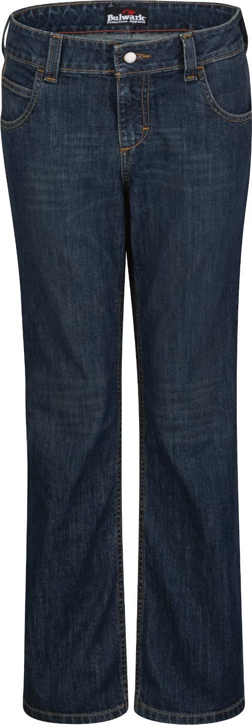Female style. Straight fit with stretch. Washed and sanded denim for comfortable and fashionable look and feel. One piece, contoured waistband with button closure for optimum fit. Five jean-style pockets Felled inseam and seat seam for added durability