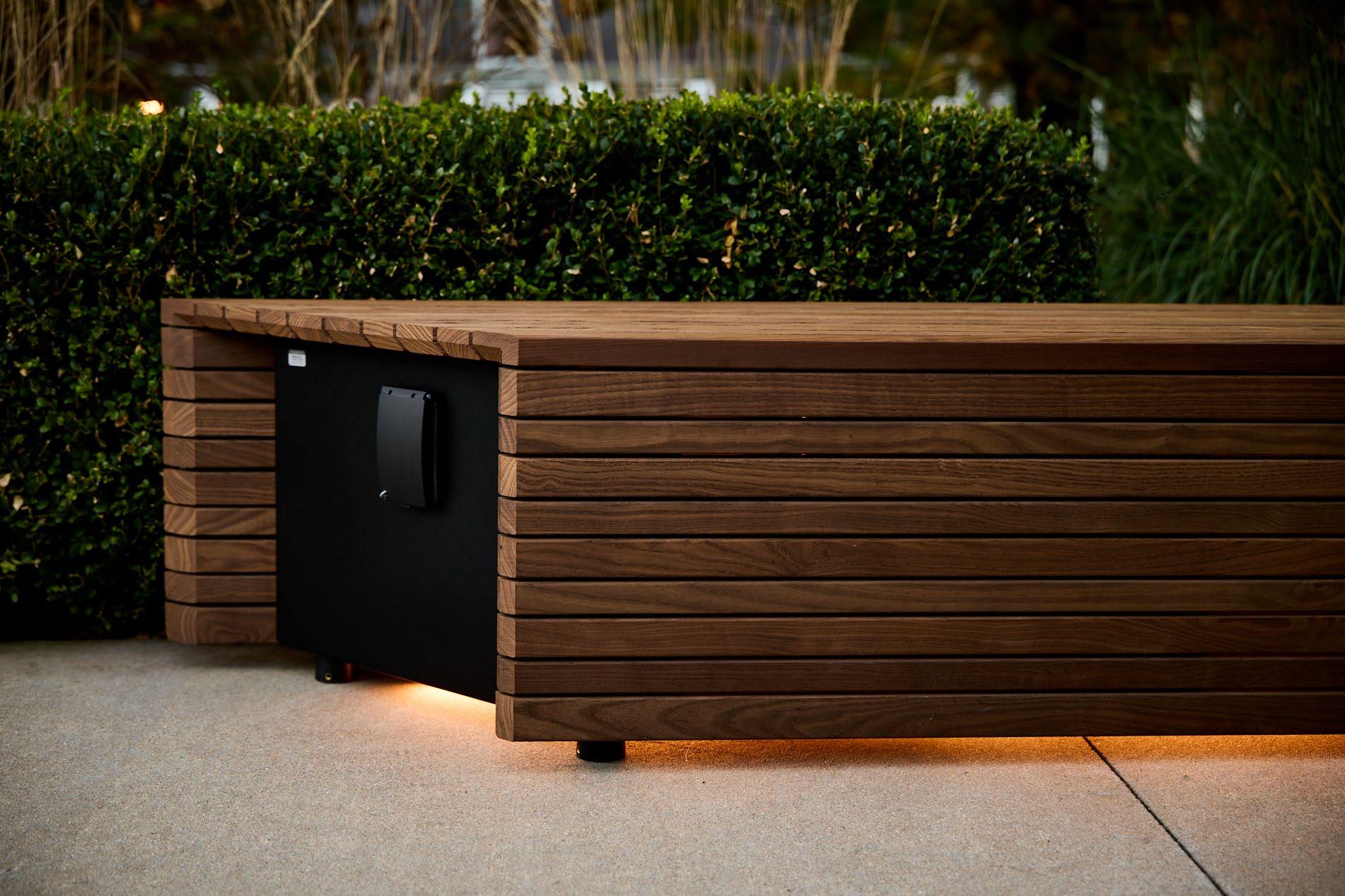 Planter with High Back Wood Bench Seating and Outdoor Power