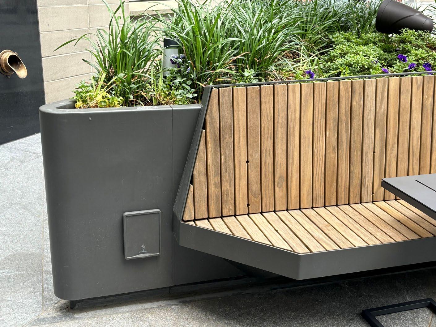 Planter with High Back Wood Bench Seating and Outdoor Power