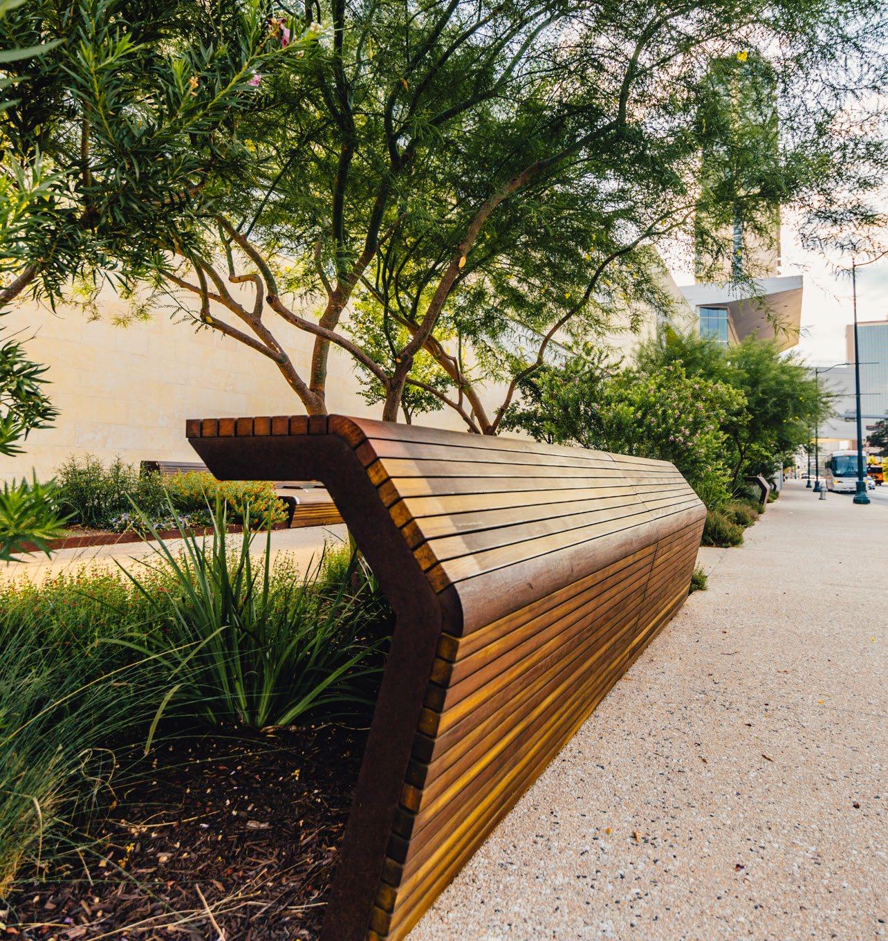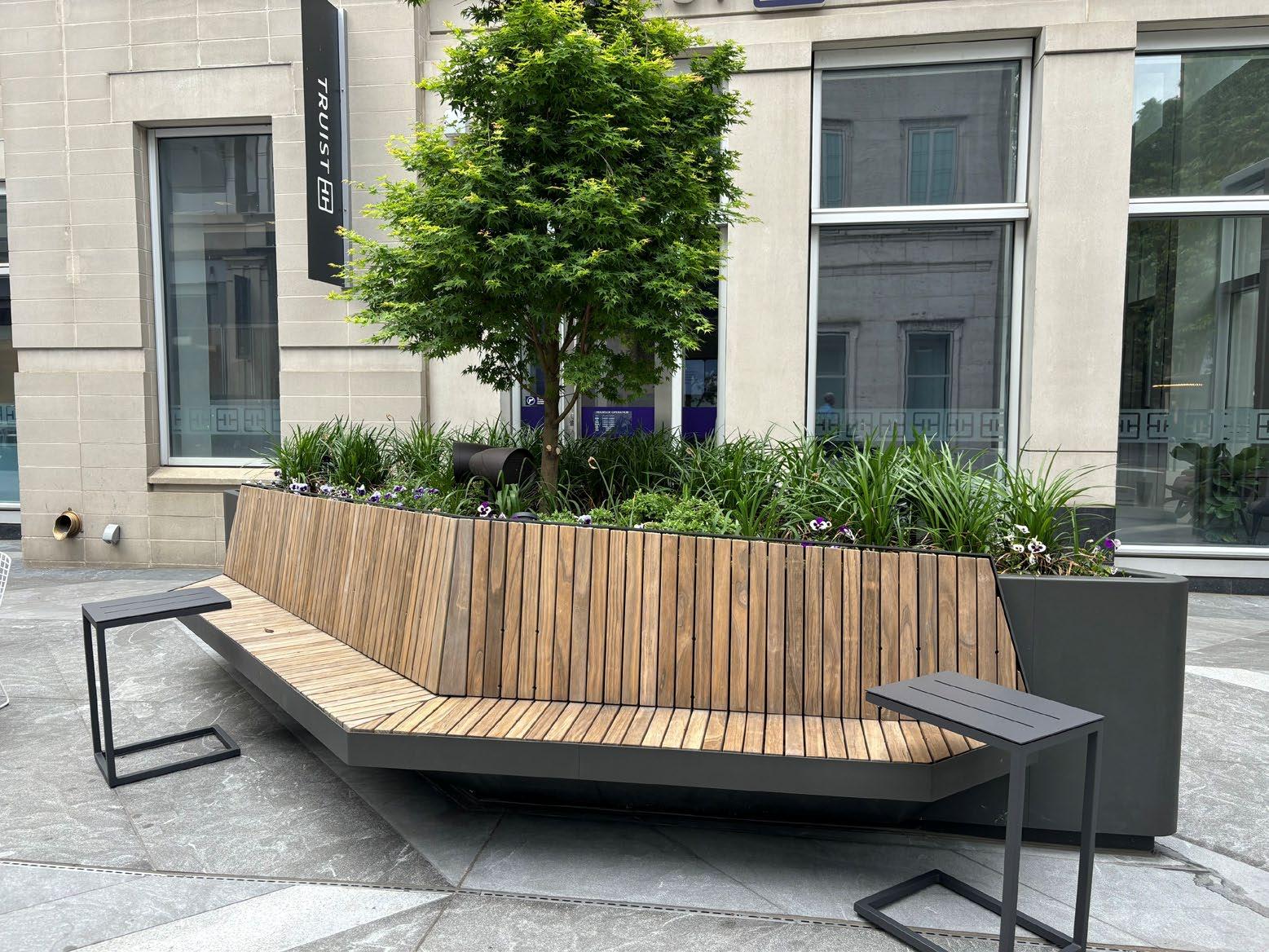 Low Moveable Planters with Cantilevered Wood Bench Seating – Stationary Planters