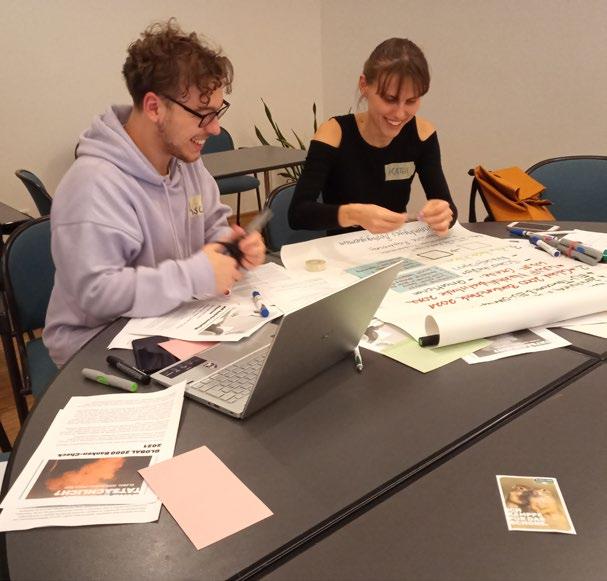 The workshop used interactive and participatory methods to support peer learning by assigning participants to three different learning stations after being briefly introduced to banks’ influence on the climate crisis. At each learning station, they took one of three roles in the finance sector: Banks, Climate Crisis and Environmental NGOs, and Bank Customers. Participants discussed different conceptions of the corresponding topic at each station and answered relevant questions At the end of the group work, they created a poster summarising their most important takeaways. Afterwards, the groups presented their posters to the