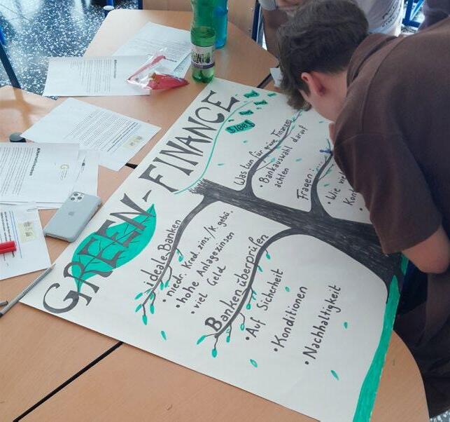 All groups received the same worksheets with three topics/questions for a “Green Finance Toolkit” and were asked to read their texts and directly collect the essential key points. Afterwards, the posters were presented to the other students, and the facilitator summarised the “Green Finance Toolkit” for the class.