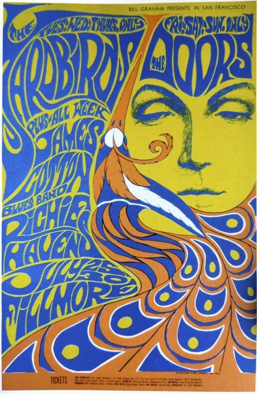 Well, I think you've got a similar thing in terms of things being eye-catching I think psychedelic rock artwork when you look at some of the newAmerican stuff from the Filmore East and the Avalon ballroom, and all those kind of places, they are doing what posters need to do They are eye-catching They obviously are often using a lot of colour, but some of them are using quite limited palettes, probably because of cost implications So, maybe like three colour prints or two colour prints spot colours and the same in with the UK stuff. I mean you had the Fool and he did a lot of the posters in the 60s in London and he painted the outside of the Beatles boutique shop.