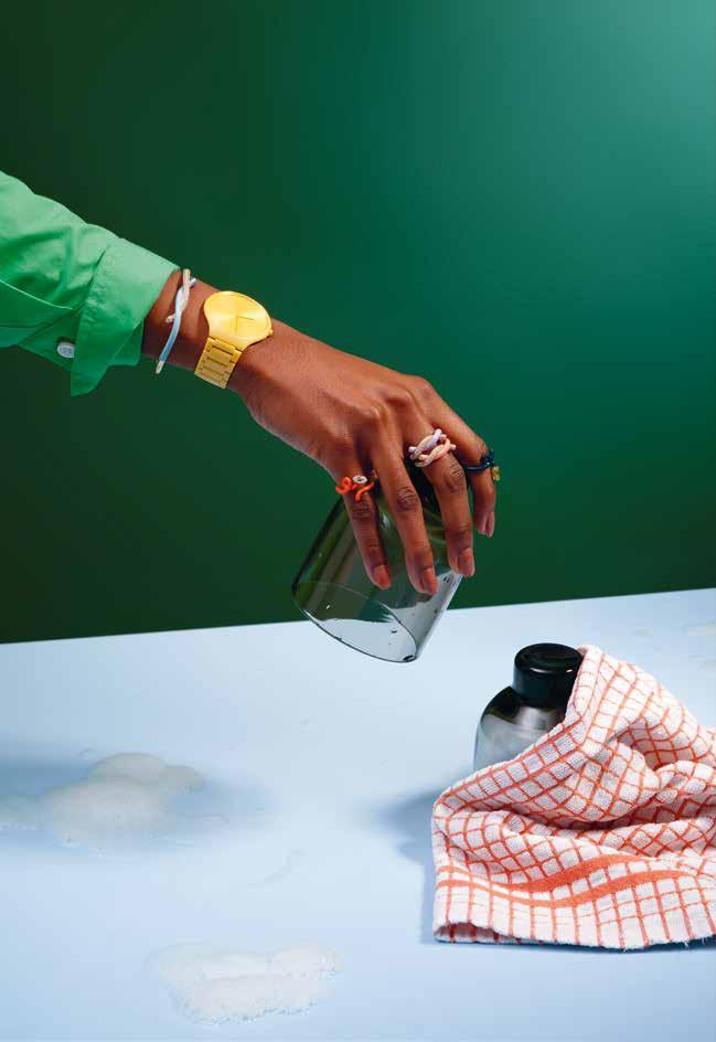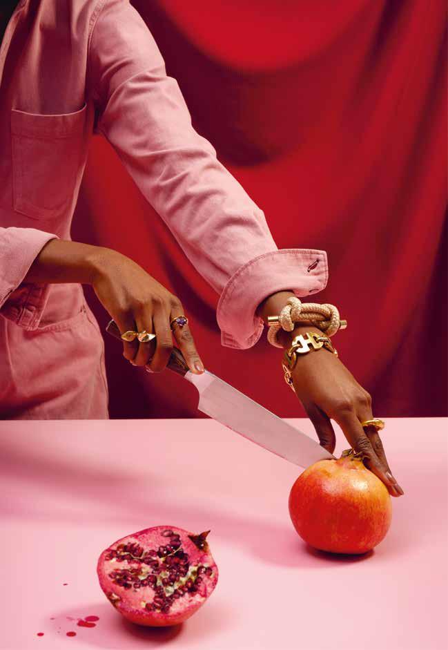 Model’s left hand: rope Sacred Knot bracelet, Pichulik at Akojo Market (akojomarket.com); Fancy Link bracelet, Celine at Omnēque (omneque.com); Gold ring, Alighieri (as before). Model’s right hand: 18ct gold Rose & Diamond ring, Cece Jewellery (as before); 9ct gold Lir ring, Angharad (angharadstudio. com); Oui ring, Dior at Omnēque (as before). Dress, Rag & Bone at The Outnet (as before)
