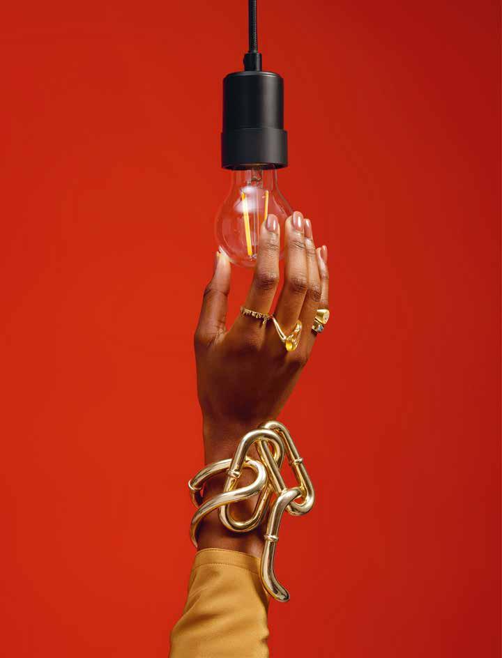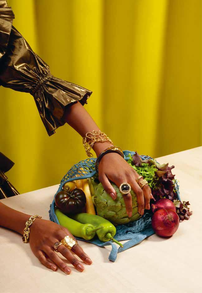 Model’s left hand: black Tube bracelet, Emefa Cole (as before); Trace gold vermeil bracelet, Completedworks (completedworks. com); 18ct gold Black Diamond Castle ring, Theo Fennell (theofennell.com); gold ring, Alighieri (alighieri.co.uk); goldplated ring, Ruby Jack (rubyjack. com). Model’s right hand: Mamara bracelet, Ruby Jack (as before); 18ct rose gold Engraved Snake signet ring, Theo Fennell (as before); gold vermeil ring, Completedworks (as before). Bronze ruffled lamé mini dress, Dolce & Gabbana at The Outnet (as before)