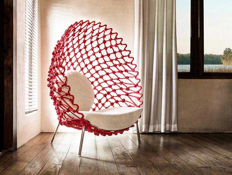 The Dragnet is an ovoid chair made with structured rope net, supported by four flaring metal legs. The delicate yet massive form defines Cobonpue's mastery of the sculptural manipulation of materials.