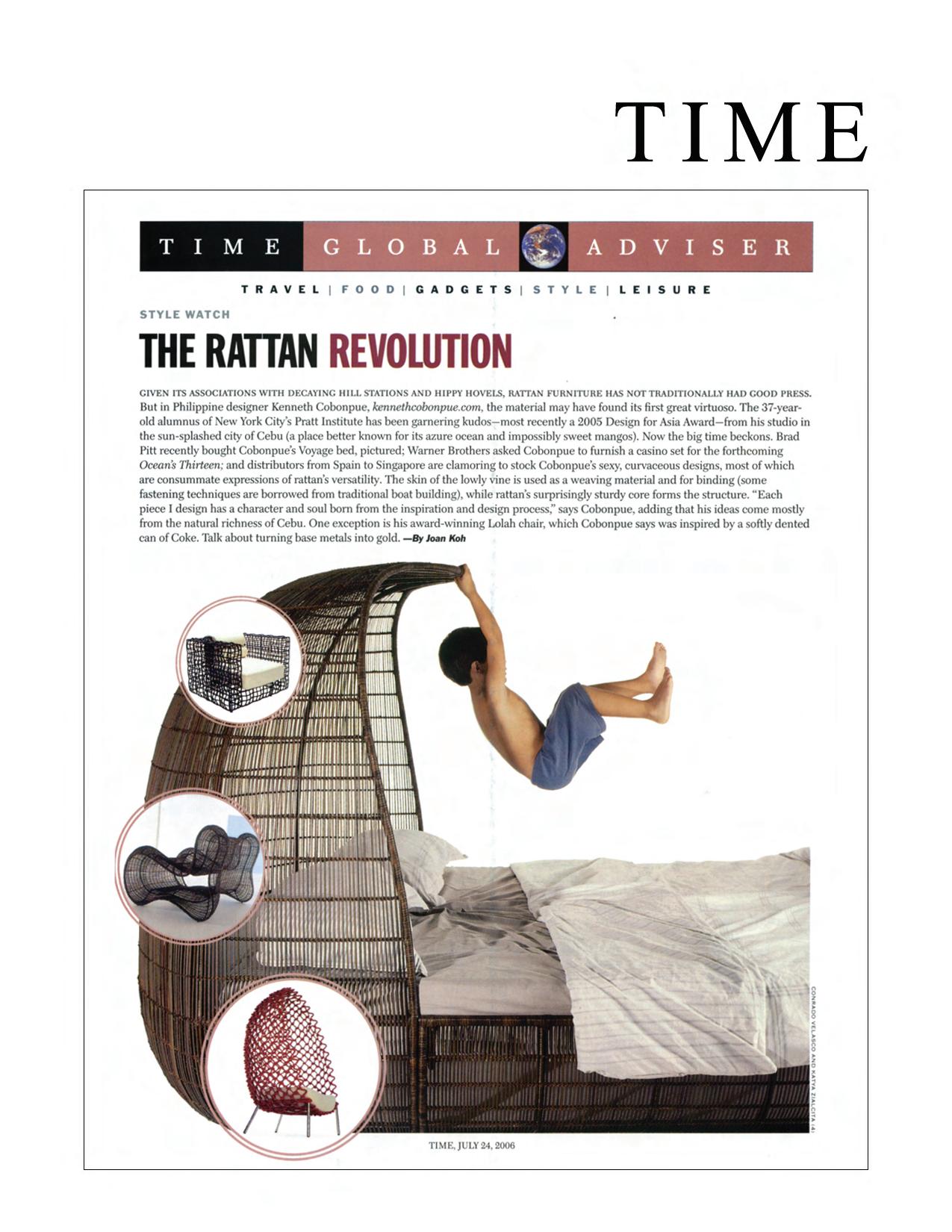 But in Philippine designer Kenneth Cobonpue, kennethcobonpue.com, the material may have found its first great virtuoso. The 37-year- old alumnus of New York City's Pratt Institute has been garnering kudos-most recently a 2005 Design for Asia Award-from his studio in the sun-splashed city of Cebu (a place better known for its azure ocean and impossibly sweet mangos). Now the big time beckons. Brad Pitt recently bought Cobonpue's Voyage bed, pictured; Warner Brothers asked Cobonpue to furnish a casino set for the forthcoming Ocean's Thirteen; and distributors from Spain to Singapore are clamoring to stock Cobonpue's sexy, curvaceous designs, most of which are consummate expressions of rattan's versatility. The skin of the lowly vine is used as a weaving material and for binding (some fastening techniques are borrowed from traditional boat building), while rattan's surprisingly sturdy core forms the structure. "Each piece I design has a character and soul born from the inspiration and design process," says Cobonpue, adding that his ideas come mostly from the natural richness of Cebu. One exception is his award-winning Lolah chair, which Cobonpue says was inspired by a softly dented can of Coke. Talk about turning base metals into gold. –By Joan Koh