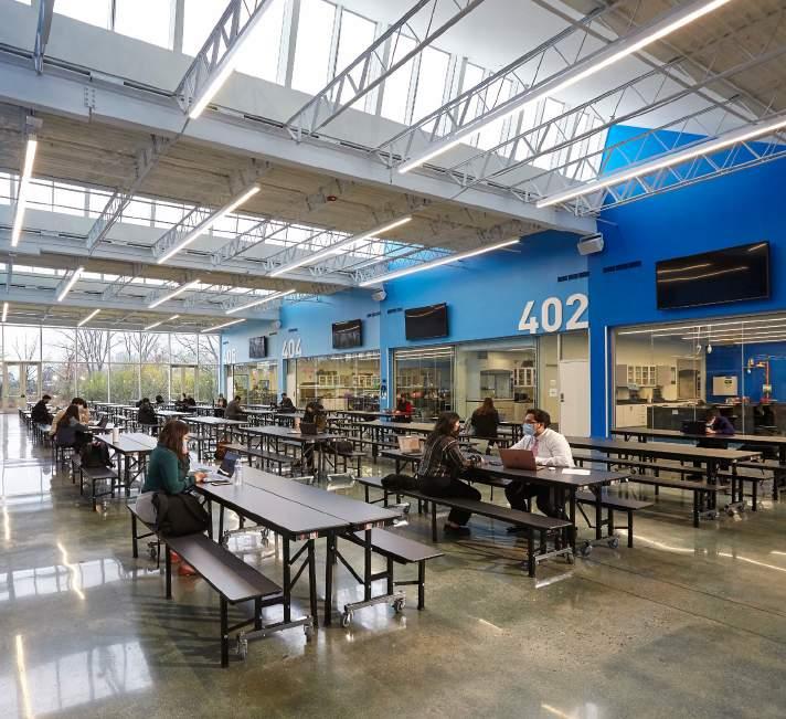 The original concrete floors were polished and stained to reflect additional light, while their vibrant colors warm the space. The school’s desire to have an open and transparent pedagogy resulted in a fullheight wall of glazing in each classroom.