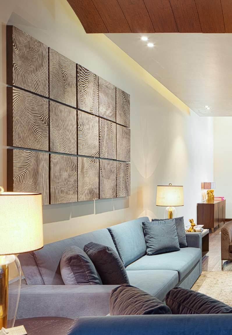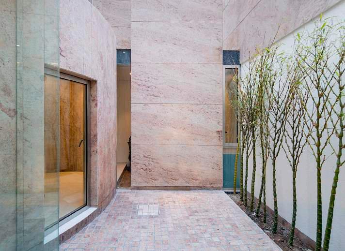Monolithic wooden flooring spans extensively across most rooms for visual and material congruity, tying together various spatial characters. All floor furnishings, including carpets, have been customized specifically for the house. The lighting scheme, too, is bespoke and customizable, featuring floating ceilings fitted with automated mood lights for controllable environments. Lighting fixtures positioned to be accent - oriented rather than ambient create intentional pockets of bright spots - perfect for highlighting artwork and bespoke, premium luxury furniture elements. Meticulous, understated detailing of the most miniature fittings - such as the door handles, customized in metal and polished to a champagne/brass sheen 0 adds a unique cachet to the attentive designing at play throughout the residence.