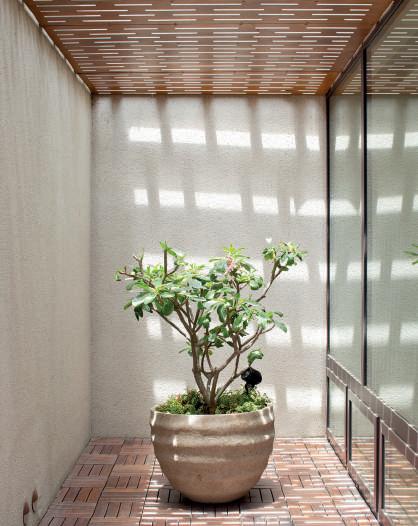 Ascending the level above to the newest volumetric addition, the second floor consists of a bedroom with an attached bath, a well - equipped gymnasium, and a puja room flanking a terrace that opens up towards the sky. A solitary, verdant “Champa” tree blooms at one end, framed under a horizontal perforated trellis, forming patterns in the light.