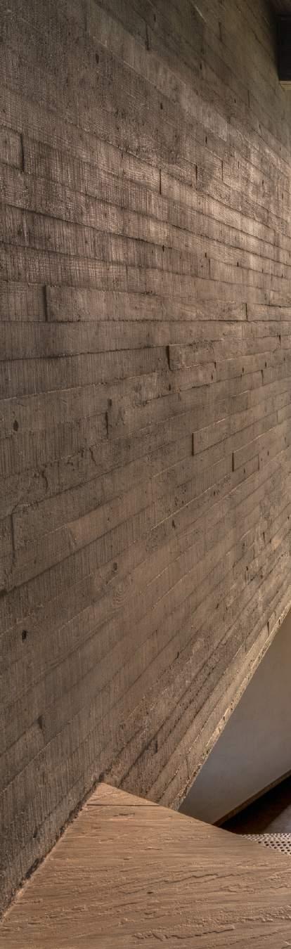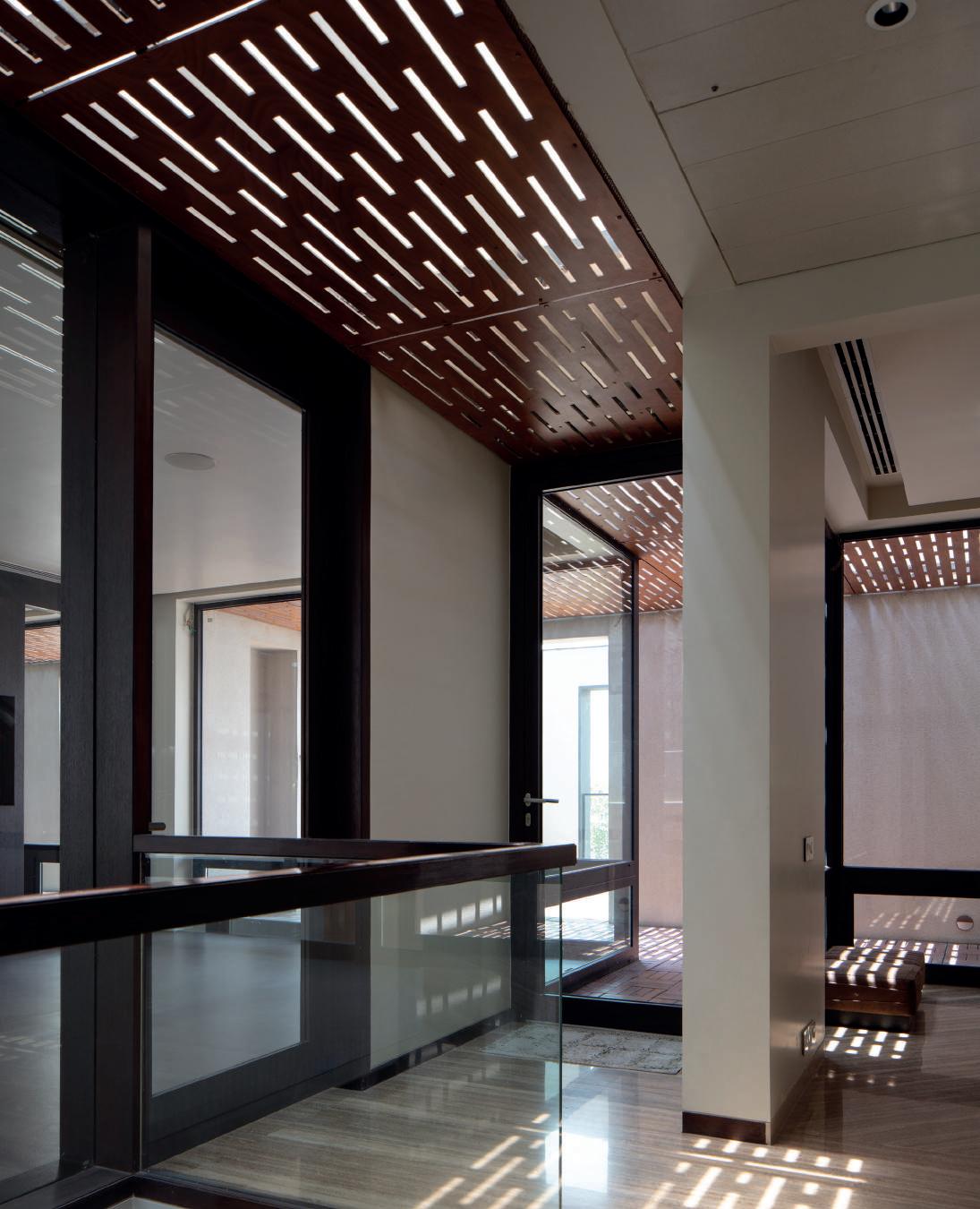 Fabricated using laminated wooden panels with rhythmic perforations, the trellis emerges as a unifying element for the residence, essential in defining its architectural character. It takes the form of a horizontal skylight along the path of the staircase and spreads to encompass the terrace, transforming vertically as a screen to afford a degree of privacy to the secondfloor bedroom. An inseparable component of the built mass, the rhythmic pattern creates dramatic plays of light and shadow through the day.