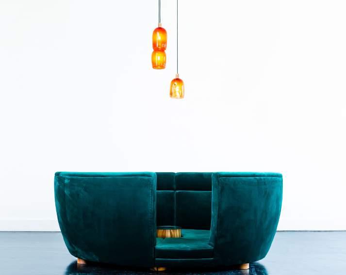 Intimacy is strongly based on touch and smell. ‘Dare to Feel’ was designed to give users increased possibilities to maintain relations in real life by using these key senses. The low-seat sofa is a space to spend time together or to be only with your own emotions by splitting it into two armchairs. The upholstery material used for this object is velvet which allows the emotional and tactile experience. To give a warm and natural touch to the sofa, walnut wood was used for the finishing. Based on the feedback from Millennials, the sense of smell is an essential element of intimacy as well as varying temperatures of light. In line with this, a glass, light-based object was created. The increasing temperature of light releases an aroma from the ceramic ring which is placed on the lightbulb. The aroma can bring intimate memories back or create completely new ones. Colours, materials, and shapes in both designed objects create an environment which is not only a comfortable place for the individual or a couple but will give this feeling of safety to open up about emotions.