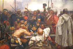 » A palavra “cossaco” vem do russo kazak. O termo é originário do turco e quer dizer “aven tureiro” ou “homem livre”. Os cossacos são um povo proveniente das estepes da Euro pa oriental, ao norte do mar Negro e do mar Cáspio. Eles têm parentesco com o atual povo cazaque, que hoje vive no Cazaquis tão, situado ao sul da Rússia. O termo “cos saco” também designa os soldados que ser viam no exército do czar (imperador) da Rús sia, principalmente na cavalaria. Os cossacos dividiam-se em dois principais grupos étni cos: os cossacos zaporojianos, que habita vam as estepes da Ucrânia; e os cossacos russos, das regiões fronteiriças do Principado de Moscóvia (sediado em Moscou).