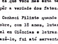 Entretanto, como você, eu sou um homem e não posso mais omitir-me a respeito das injustiças que você faz a Filinto Müller. Estou certo de que você não está bem in formado e eu lhe peço que me permita repor a verdade dos fatos. Conheci Filinto quando ele era Capitão, com 32 anos e eu um rapaz pobre, com 18 anos, lutando com dificuldades, apesar de já ser bacharel em Ciências e Letras. Vim de Mato Grosso para estudar e, para fazê-lo, fui até servente. Passei privações até que Filinto me acolheu, dando-me um emprego de investigador especial, mas dando -me, mais do que o emprego, a certeza de que eu já não estava só. Na Polícia, ser vi a Filinto com o maior entusiasmo, expondo inúmeras vezes a minha vida. Dei e le vei tiros, especialmente na fase aguda do comunismo. Muitas vezes tivemos que agir com violência, reprimindo violência, mas jamais houve a covardia, a perversidade e crueldade que você insiste em imputar a Filinto. Isso representa uma contradição na sua vida de jornalista. Você diz tantas verdades, fica sabendo que isso é uma menti ra. Fui testemunha ocular dos fatos.