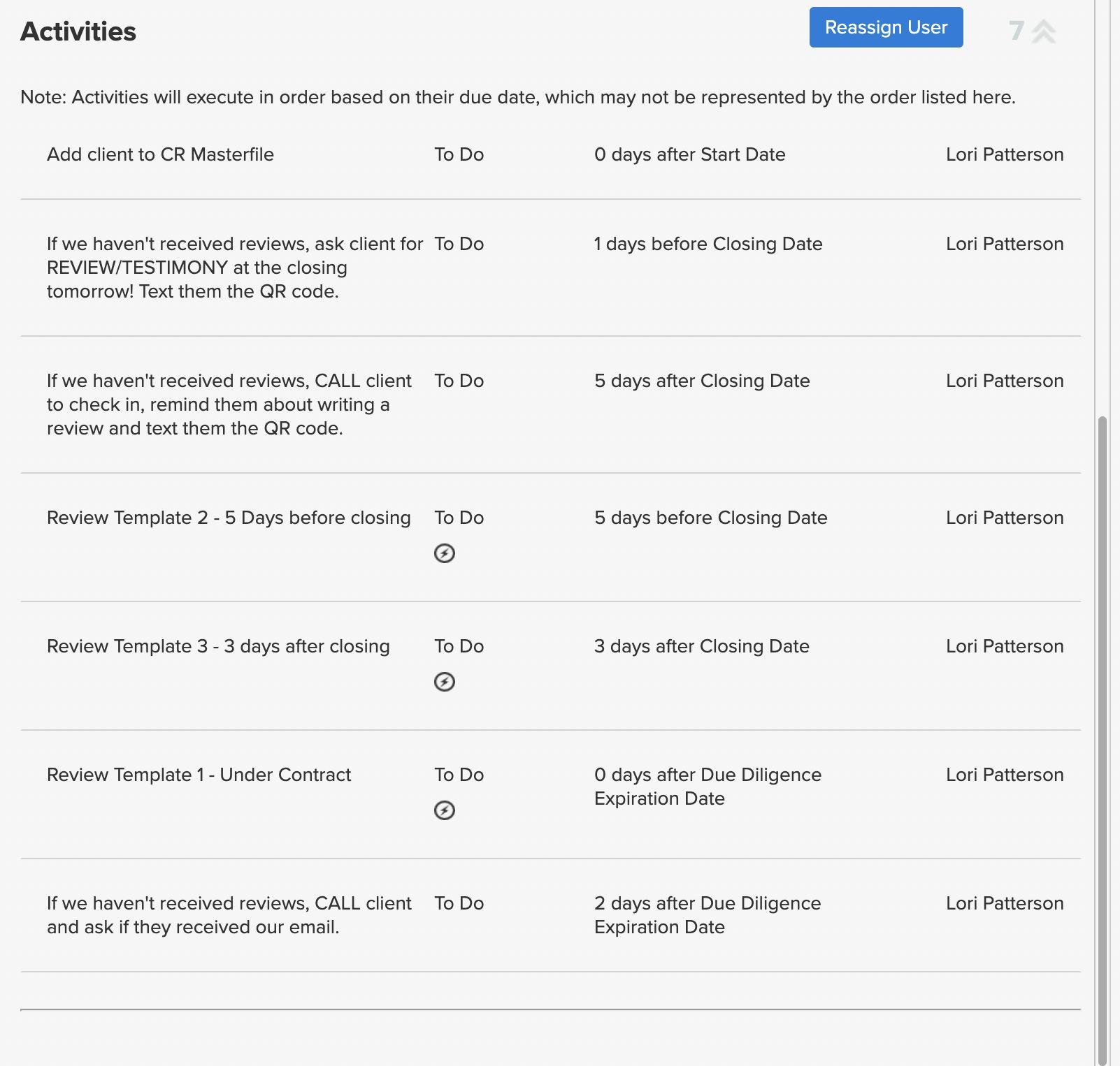 g. One day after, listing agent calls to check in if listing agreement has not been signed. This task repeats each week.