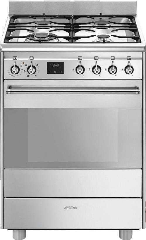60cm Dual Fuel Freestanding Cooker FS61XNG8-1 This Smeg upright cooker features an electricpowered oven and a gas-powered cooktop. With 4 burners, 7 oven functions and a 79L capacity, you can cook without racing around the kitchen thanks to this Smeg cooker.