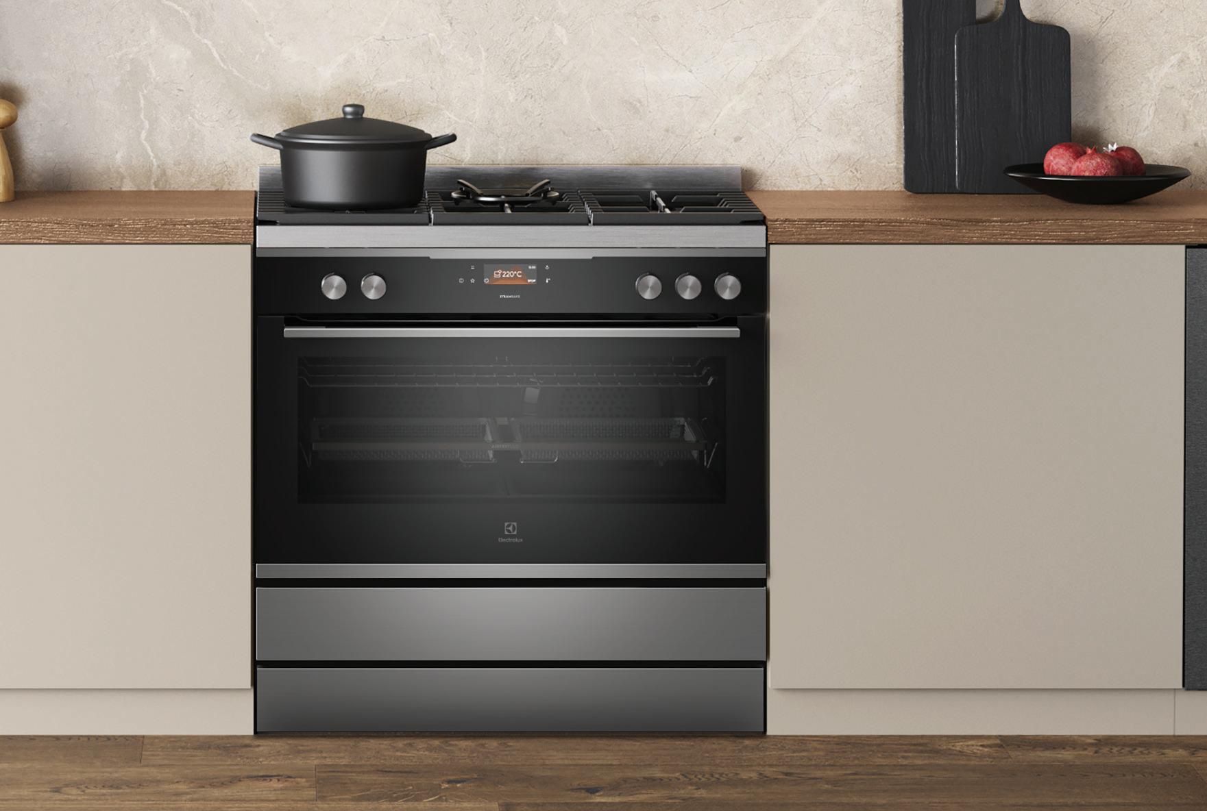 The special Vapour Clean function uses steam to lift spillages and burnt on food residue allowing for an extremely easy clean. 6 oven functions and 5 burner cooktop, 126L capacity.