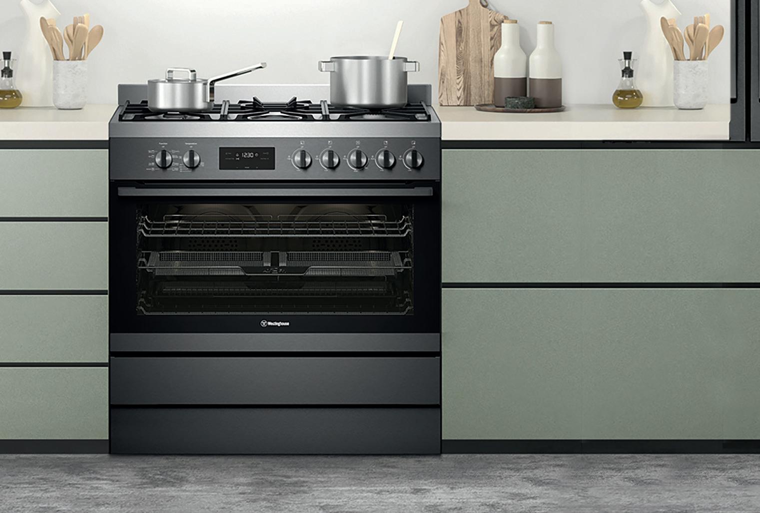 90cm Pyrolytic Dual Fuel Freestanding Cooker WFEP917DSD Even cleaning up is easier with Westinghouse. PyroClean means with the press of a button you can keep your oven shiny and clean. 10 oven functions, 125L capacity.