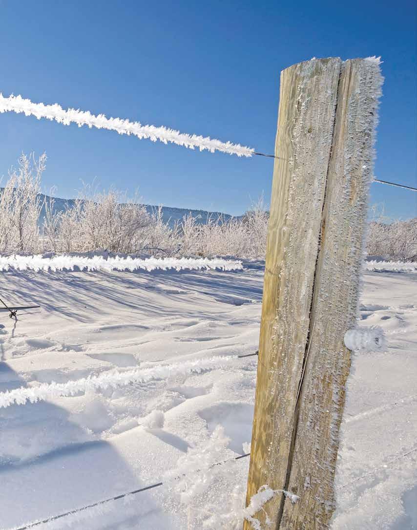 ICE CRYSTALS CLING like rock candy to a wire fence north of Durango as Cheryl Albrecht-Harvey cross-country skis in the Animas River Valley. Though the temperature is well below freezing this morning, there isn’t a cloud in the sky.