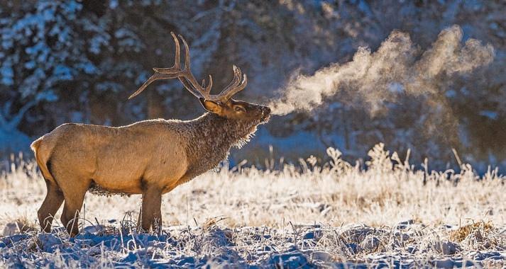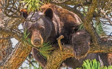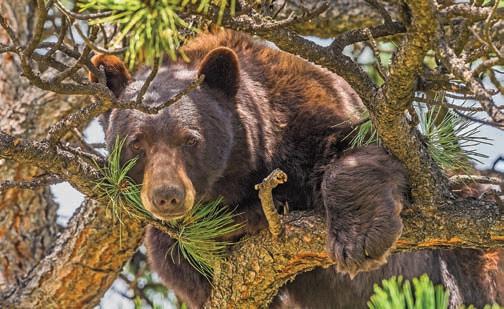 Page 18 A bull elk bugels on a cold morning in Estes Park. A black bear lounges in a tree on a sunny day in Estes Park.