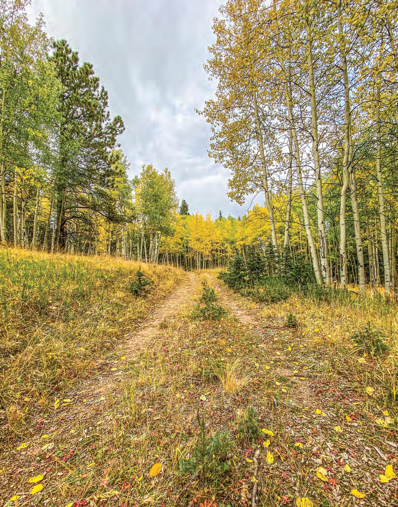 Looking east, Marcellina Mountain rises beyond a curving canopy of aspen. Try framing the gravel road as a leading line, then zoom in for detail shots of kaleidoscopic trunks and ferns in the underbrush.