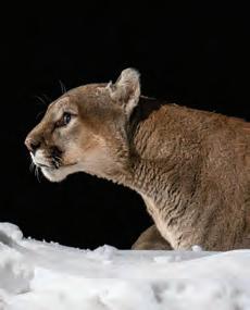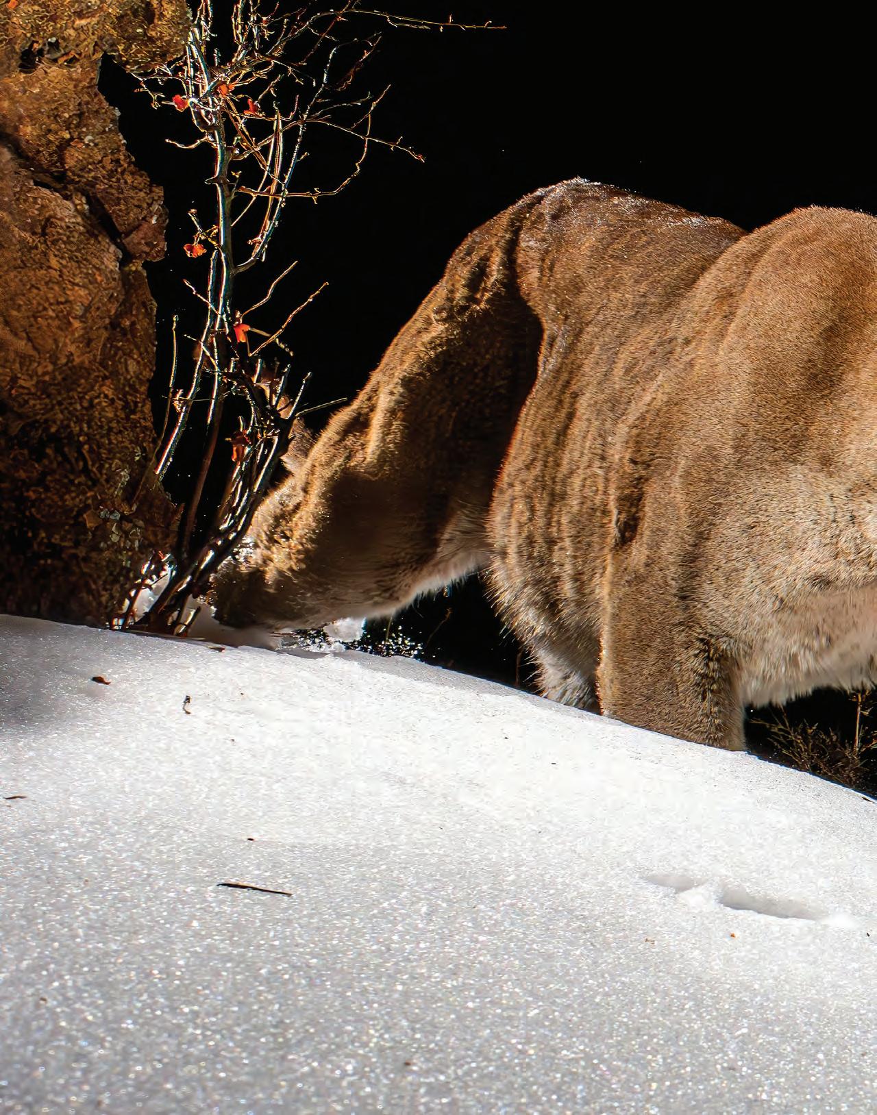 A mountain lion (Puma concolor) glides through fresh snowfall before midnight near Estes Park, every muscle and whisker caught sharply by a camera trap. Story begins on page 18.