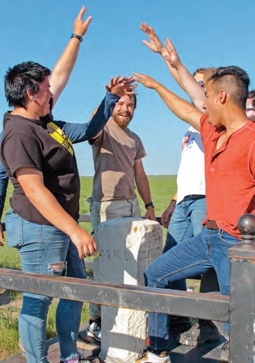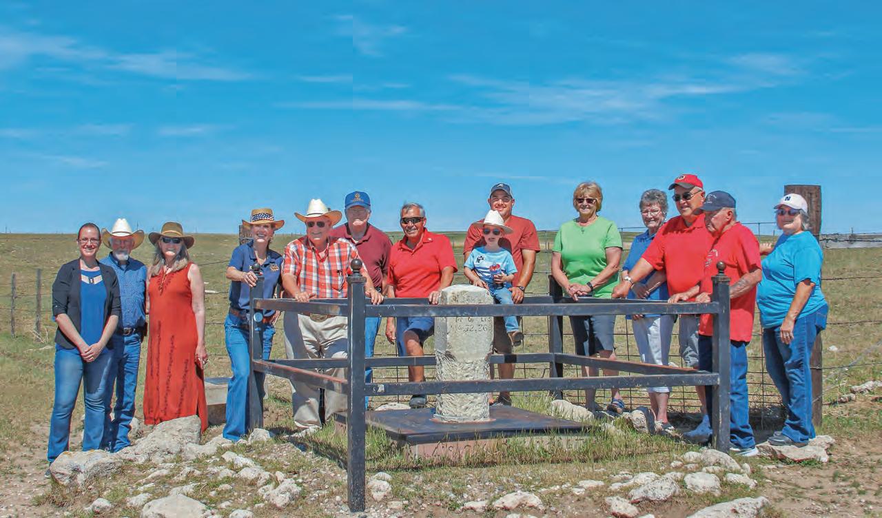 Members of the NCCC AmeriCorps team, who assisted Kimball County groups during recent efforts, celebrate being in three states at once. The marker’s brass disc has been around since 1990.