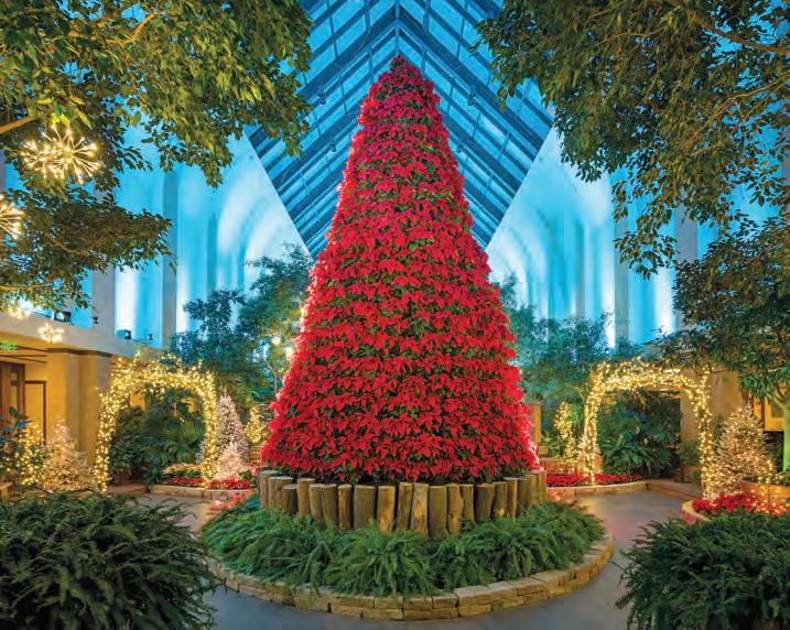 The scent of pine and the twinkle of lights reflected in frosted leaves welcome you into Lauritzen Gardens’ indoor gardens. The winter wonderland’s centerpiece – a towering 20-foot-tall poinsettia tree –soars as a beacon of holiday magic. Its vibrant red blooms cascade in idyllic symmetry, reaching skyward under soft holiday luster.