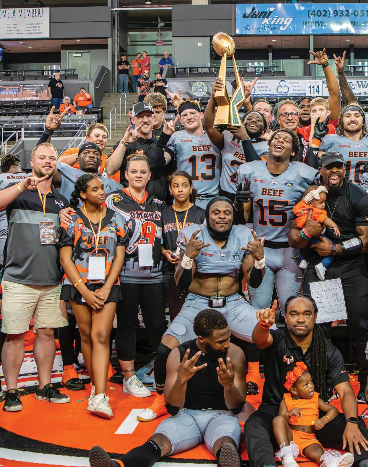 THE LIGHTS DIM in Omaha’s Liberty First Credit Union Arena – nicknamed The Slaughterhouse. Spotlights dart across the faces of a few thousand fans in the stands. Cowbells ring. Music blares. A Jeep fresh off the dealership lot cruises out of an inflated bull tunnel. It is game night for the Omaha Beef indoor football team, the oldest active team in the nation. Waving a team flag, the Beef’s mascot, Sir Loin, raises his hands, exhorting the crowd to stand on its feet and cheer on the team.