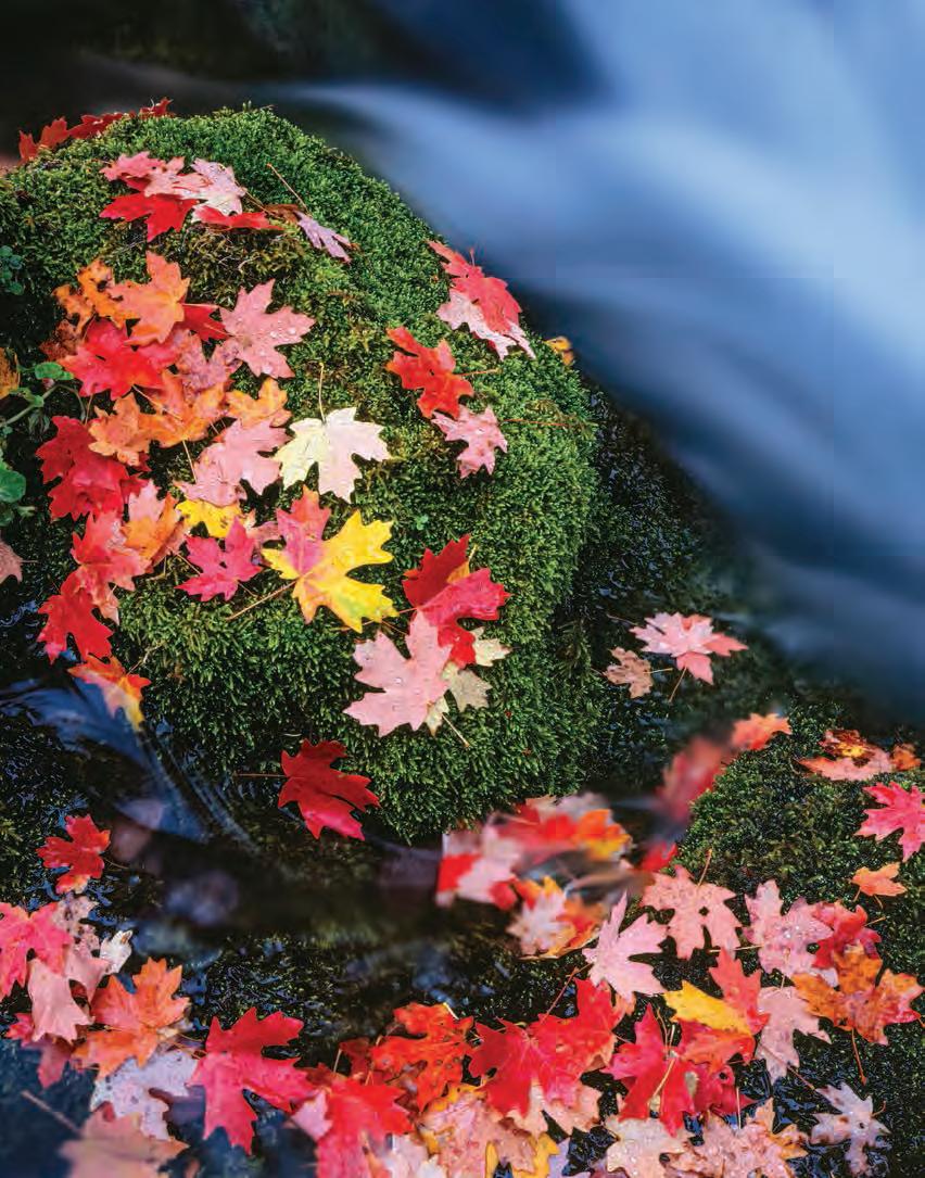 Photographer Kevin Mikkelsen and his wife were nearing the end of a two-week fall foliage expedition when they spotted this scene while driving on Highway 144. They quickly turned around and parked, then Mikkelsen hopped out and hiked a half mile up the road to a bridge. He crossed to the other side of the river to get this shot with the waterfall and rock features in the foreground.