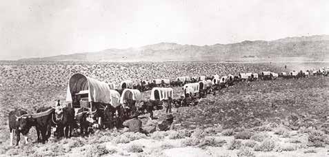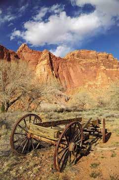 Page 14 Wagons cross the Salt Lake Valley. A statue honors Mormon Battalion soldiers. Page 15 A Latter-day Saint pioneer wagon can be found at Capitol Reef National Park.