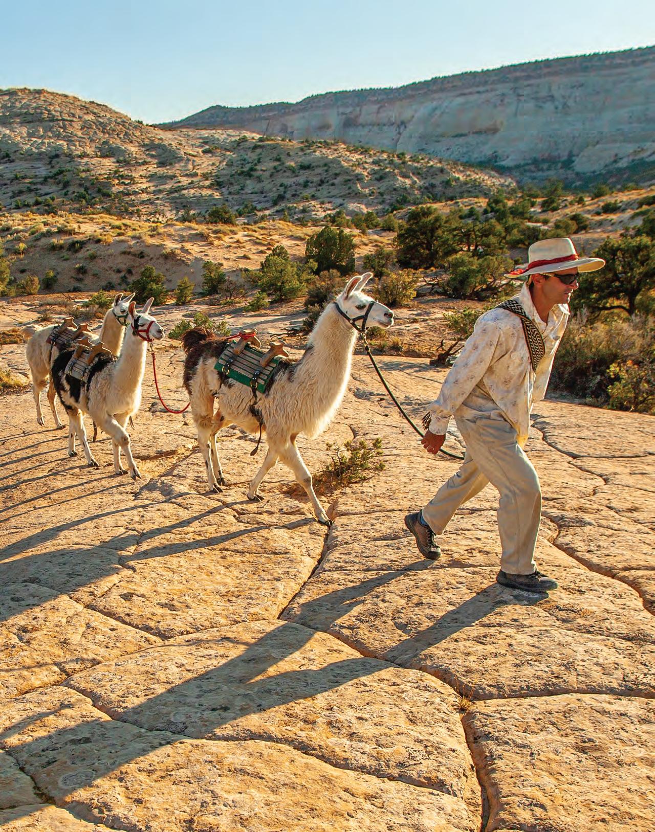 The llamas make this off-trail travel possible. Native to the high Andes, they are perfectly suited for Boulder’s elevated plateaus. With padded feet more akin to a dog’s than a horse’s, they tread lightly, leaving little trace.