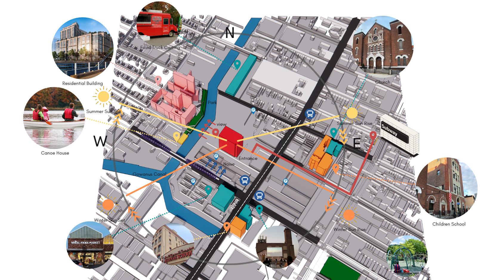 The choice to repurpose the old power house stems from its prime location. Adjacent to the river, the site offers access to a valuable water resource, while its proximity to major commute routes ensures easy accessibility. Surrounded by residential buildings and schools, the area is densely populated but lacks sufficient local grocery markets. Revitalizing this space not only addresses the community’s needs but also leverages the strategic location to create a sustainable, essential resource hub for the neighborhood.