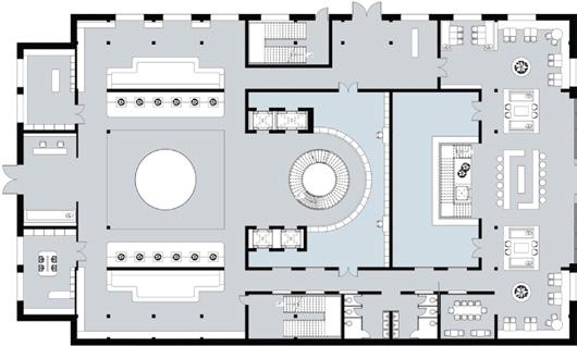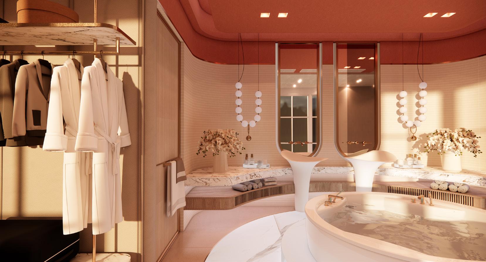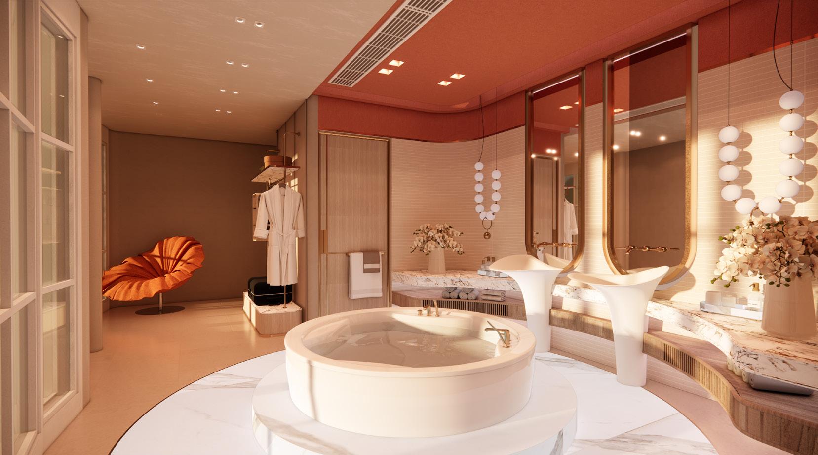 The hotel rooms are designed around the concept of circles, of soaking in an indulgent bath. The layout creates a sense of balance, soaking tub that invites guests to unwind. Curved furnishings and architectural the tranquil, relaxing atmosphere.
