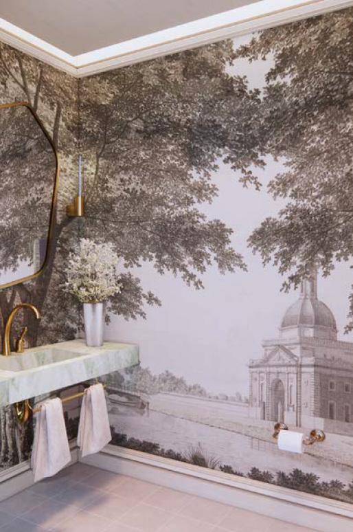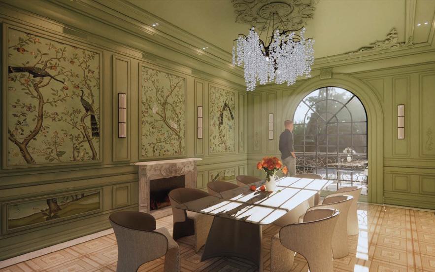 Materials and colors reflect the calming and organic hues of the natural environment, bridging indoor elegance with the tranquility of nature. The room also pays tribute to de Gournay’s wallpaper, with its intricate patterns and delicate motifs echoing throughout furnishings and accessories. The result is a dining room that radiates classical charm while celebrating nature’s timeless beauty and de Gournay’s craftsmanship.