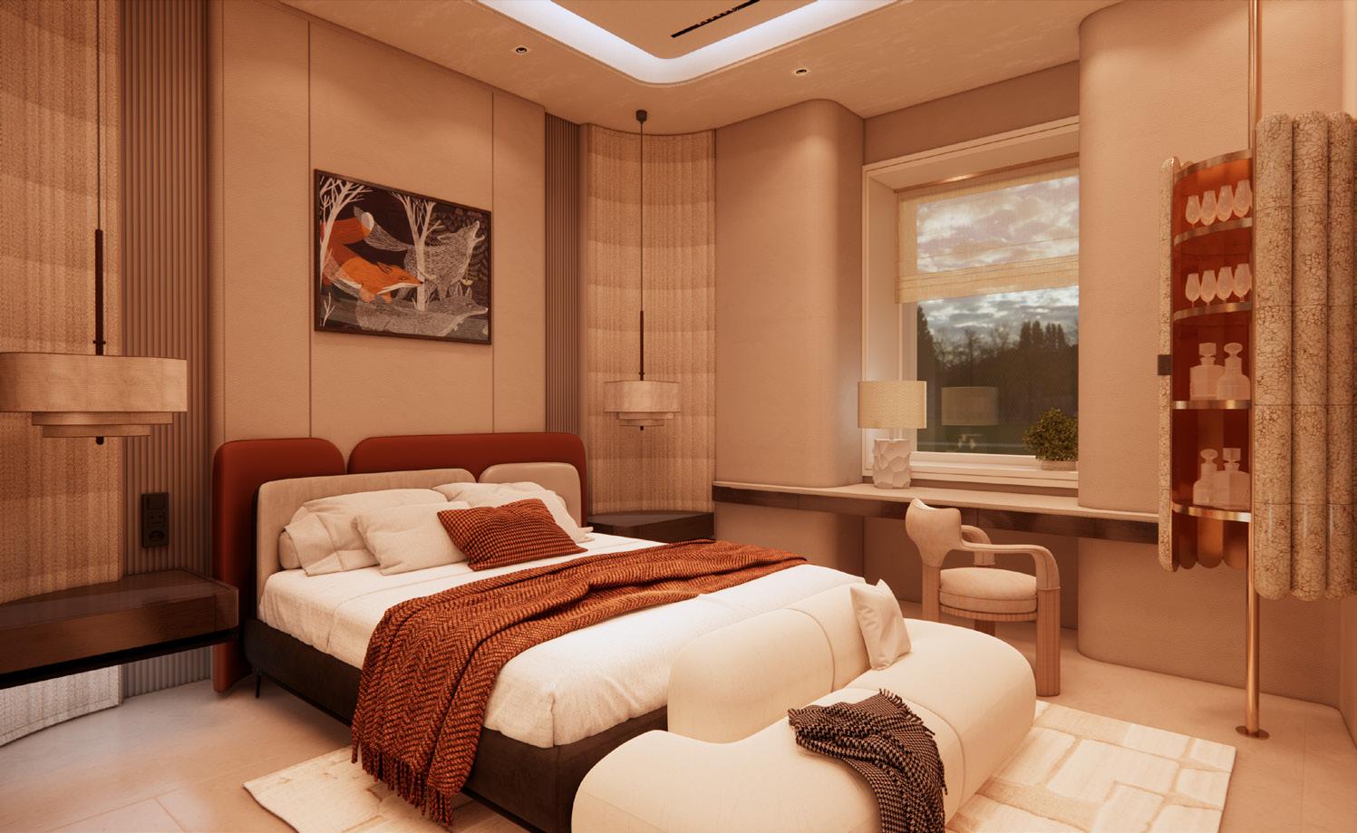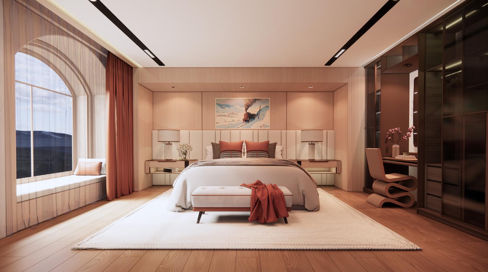 The hotel rooms are designed with a focus on symmetry, featuring resting, cleaning, and social areas to enhance comfort and functionality. modern elements, with a striking contrast of colors that highlights creating a harmonious yet dynamic atmosphere ideal for both families