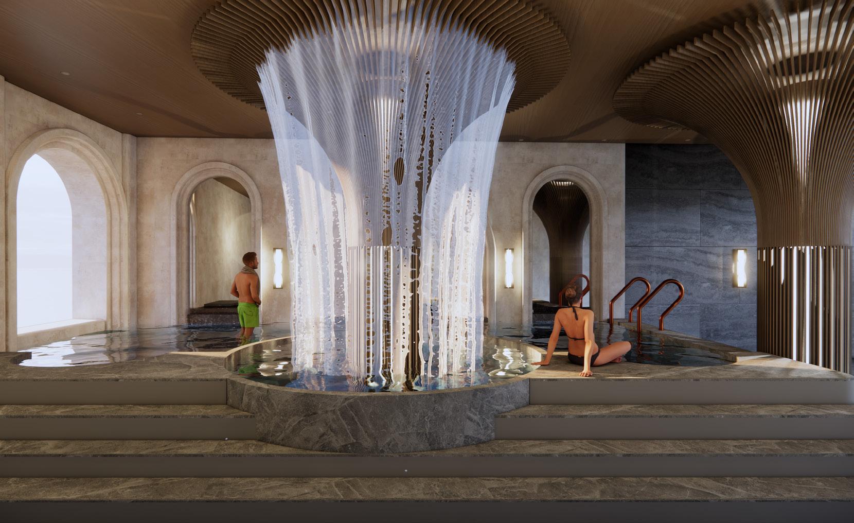 The resort boasts extraordinary sauna and spa facilities, alongside a natural hot spring that surprise and delight at every turn. Sculptural steam rooms and open-air lounges create an immersive environment, inviting guests on an unexpected journey that transforms the spa experience into something unforgettable.