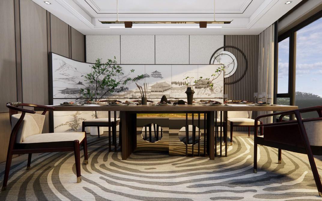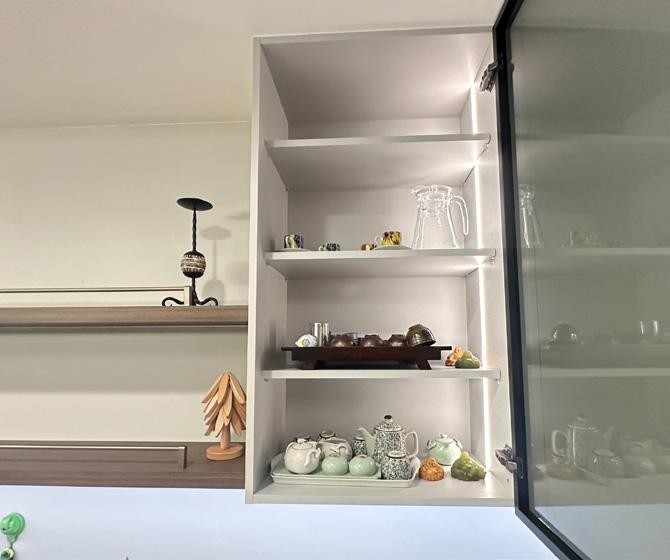 • To meet the homeowner’s storage needs and love for unique cabinetry, the dining area draws inspiration from nature. With mountain and floral motifs as the focal point, the design reflects her love of natural elements and tea gatherings, creating a serene and harmonious atmosphere.