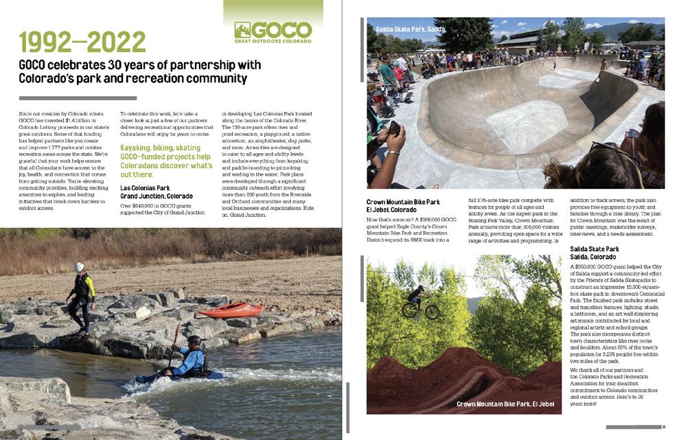 FAll 2021 SPRING 2021 24 OFFICIAL PUBLICATION COLORADO PARKS RECREATION ASSOCIATION INSIDE: AURORA A TOMORROW’ IMPORTANCE OF MAKING FITNESS GUIDE PLAYGROUND SURFACING SAFETY who go aboveand-beyond the 2021-22 COMMERCIAL BUYER’S GUIDE INSIDE! cpra-web.org 2022 ALSO INSIDE: 2022 CPRA CONFERENCE IN REVIEW OF AWARDEDALAMOSA RAISE GRANTCOMPETITIONTOGETHERWINNERS OFFICIAL PUBLICATION COLORADO PARKS RECREATION ASSOCIATION 2022-23 CPRA COMMERCIAL BUYER’S GUIDE PAGES 29-40! Outside the Box Ideas COLORADOCOMMUNITIES ALLSIZESOFFERUNIQUE& INNOVATIVEPROGRAMS * Editorial content subject to change and will be announced prior to each issue deadline.