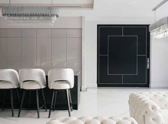 An entertainment room consisting of a home bar and golf stimulator was situated next to the kitchen and one of the biggest desires for the client was to have a door that would open up into this space when hosting. SWD produced a door that has never been made before where it measured a show stopping 2.8m x 2.4m. This was designed to be a pocket door for practicality and had a dual design to tie in with the interior scheme in both spaces. The door had a combination of two contrasting designs, on one side the door was a black stained oak with metal inlays which we produced to be the feature in the kitchen as the metal inlays tied in beautifully with the metal finishes used throughout the kitchen. On the reverse side of the door, the client aspired to have a room which had seamless panelled walls surrounding the room, which included the door opening. This side of the door was made with the same beading and panel design as the walls and even had skirting along the bottom of the door to make the blend even more flawless and to become completely disguised when the door was closed.