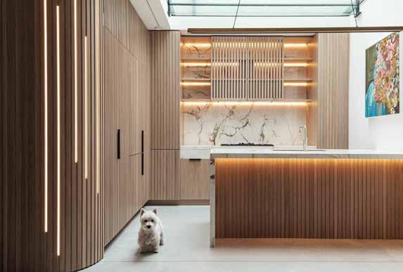 Every aspect of the design is bespoke and showcases meticulous craftsmanship. From the exquisite alabaster chandelier gracefully cascading through the center of the sculptural curved marble-clad staircase to the hand-cut leather panels adorning the wardrobe doors in the master dressing room, each detail exudes sophistication. The fitted cabinetry, including a fluted timber and leather-paneled library with an adjoining wine room, is meticulously crafted in the UK.