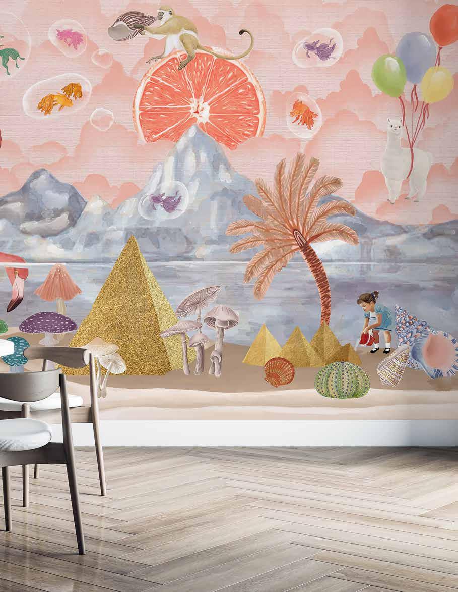 In collaboration with Lala Curio, a Hong Kong-based home decor brand renowned for reviving ancient artisanship for modern interiors, The Vale presents a truly unique and personalized wallcovering. Felix depicts an illogically uplifting seascape with captivating elements such as Koi fish encapsulated in bubbles, children building sand pyramids in school uniforms, and a monkey perched atop a slice of grapefruit blowing bubbles from a conch shell. These fantastical scenes, including a floating llama carried away on a bundle of balloons, were inspired by the work of collage artists Mohanad Shuraideh and Joe Webb, aiming to spark immense joy in viewers.