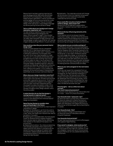 Blainey North has been creating inspiring and exciting designs since 2000 when she founded Blainey North and Associates. The Australian based company specialise in interior architecture and the design of luxury environments for a wide range of differing projects. They aim to create design which has its own unique design language as well as pushing the boundaries of design. Tell us a little about your background in design (education, experience, etc) My high school art teacher noticed I had been painting and sketching buildings for five years, without a person in sight! I then studied architecture which is my great passion in life. I do not really need motivation to keep working in the field as design is really a way of life for me. I cannot imagine doing anything different, it’s just who I am. How would you describe your personal interior design style? I strive to create spaces that are unexpected, exciting, rich in meaning and detail and are tailored specifically to each client. I believe luxury is defined by experience. It’s that gasp when you walk into an awe-inspiring space, or a sigh when you sit in a wonderfully comfortable couch and gaze around a room thinking “this is living”. There are really no rules in how to achieve this set of emotions in an interior, however I do know that great design has good proportion, beautiful materials and detailing. I also feel like it is like any amazing work of art, it has a deep concept and that underpins the creation. Luxury is about the execution of this craft and about it being tailored specifically to you, and your wants and desires. Where does your design inspiration come from? Each project has its own unique theme and idea which is born from the site, the client and the brief and is often inspired by nature or art. To do this it requires a collective of people to come together with one vision working on disparate parts of the project to enable a consistent whole. I think our firm is unique in our approach to retain that concept throughout every design decision within the entire project. In what direction do you feel that design is moving towards in a general sense? I think we are moving away from minimalism toward a more decorative and individual style of design and expression. Name five key themes to consider when approaching design in the future: 1. Being unique is always one of my most important motivations in design. 2. Design for the long term, as I think the world is moving towards buying better quality and making it last, rather than badly built interiors that need to be redone in five years. 3. Designing for a moveable client. As more people travel, our sense of home is rapidly changing. I think interiors need to reflect this by referencing their location or the needs of that space in its environment. 4. Relationship to others - Our cities are becoming more densely populated, which means living in closer proximity with others. In the same way our sense of privacy is changing with social media and phones. I believe spaces need to be more considerate of others in the future rather than being internally focused.